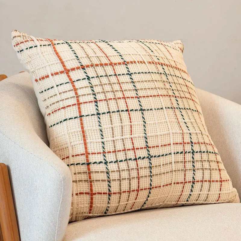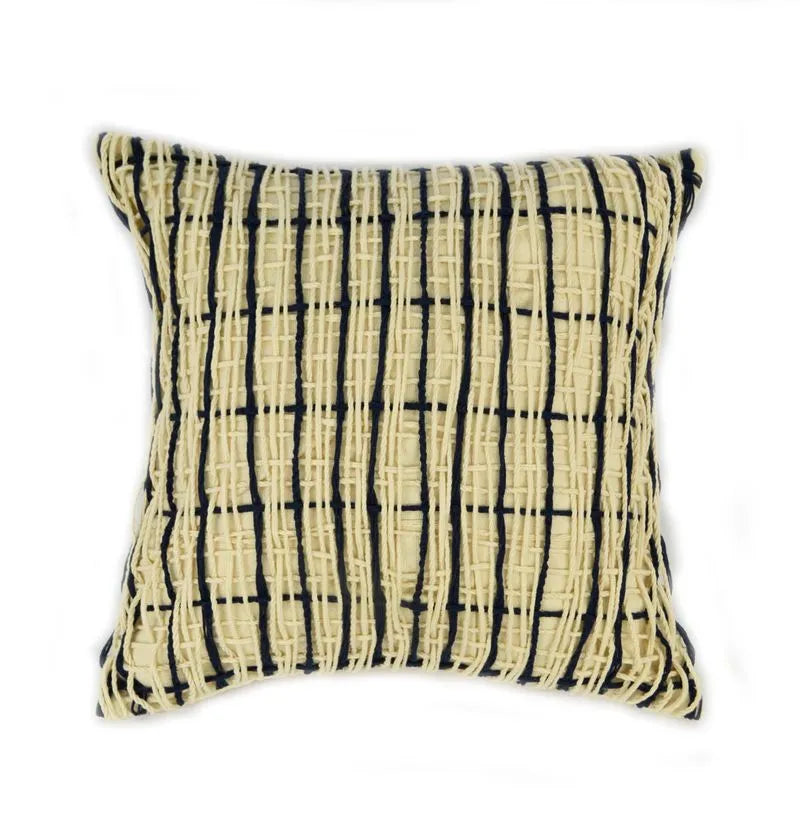 A almofada traz um design sofisticado e aconchegante, com detalhes em corda dispostos em linhas...