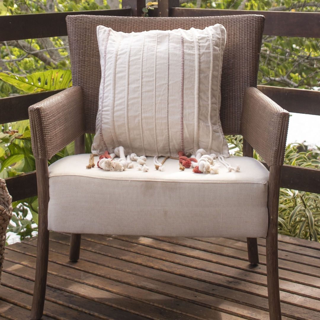 Almofadas produzem possibilidades e variedade no ambiente! Nossa capa de almofada Cactos tem tecido plano reciclado e detalhes manuais em trancelim. Seu acabamento diferenciado é feito com cordas que descem do próprio tecido e nós nas extremidades. Não acompanha enchimento.