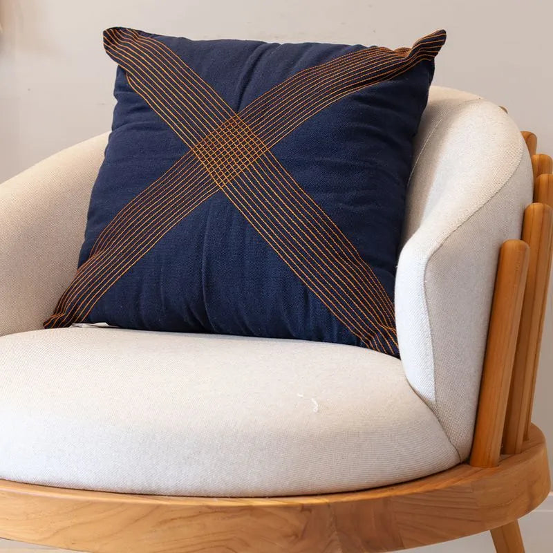 Com design moderno e marcante, a Dallas Full traz um padrão xadrez completo em linhas finas terrosas sobre o fundo azul marinho, criando uma composição sofisticada e contemporânea. Ideal para quem busca um toque de personalidade e elegância na decoração, seja em sofás, poltronas ou camas.