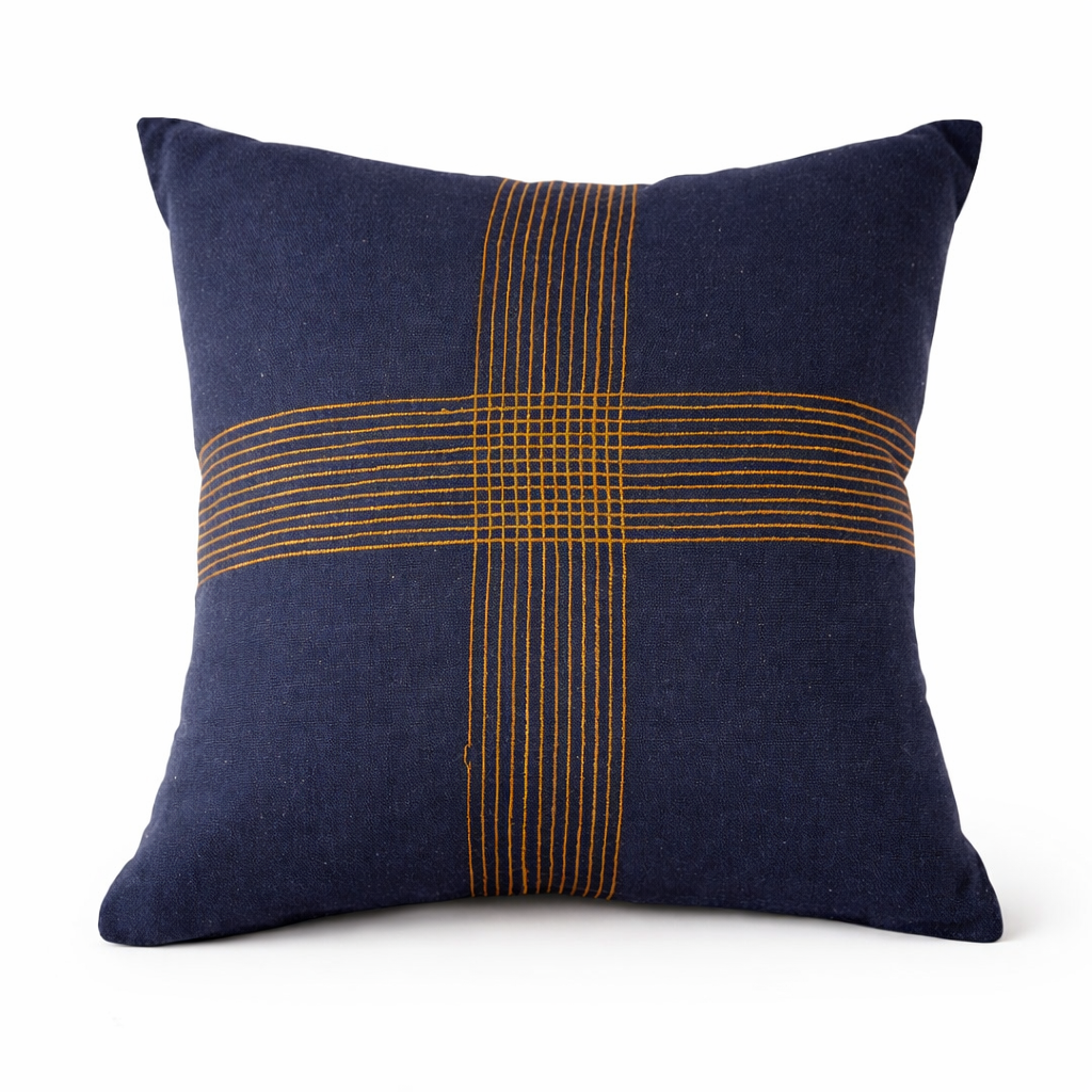 Com design moderno e marcante, a Dallas Cross traz um padrão xadrez completo em linhas finas terrosas sobre o fundo azul marinho, criando uma composição sofisticada e contemporânea. Ideal para quem busca um toque de personalidade e elegância na decoração, seja em sofás, poltronas ou camas.