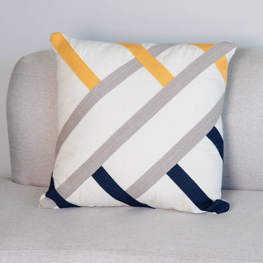 Com um visual moderno e cheio de estilo, a Capa de Almofada Linhas em Movimento traz um toque contemporâneo para a decoração. Suas faixas em tons neutros com detalhes em amarelo e azul criam um contraste elegante e dinâmico, perfeito para dar vida ao sofá, poltrona ou cama sem pesar no ambiente.