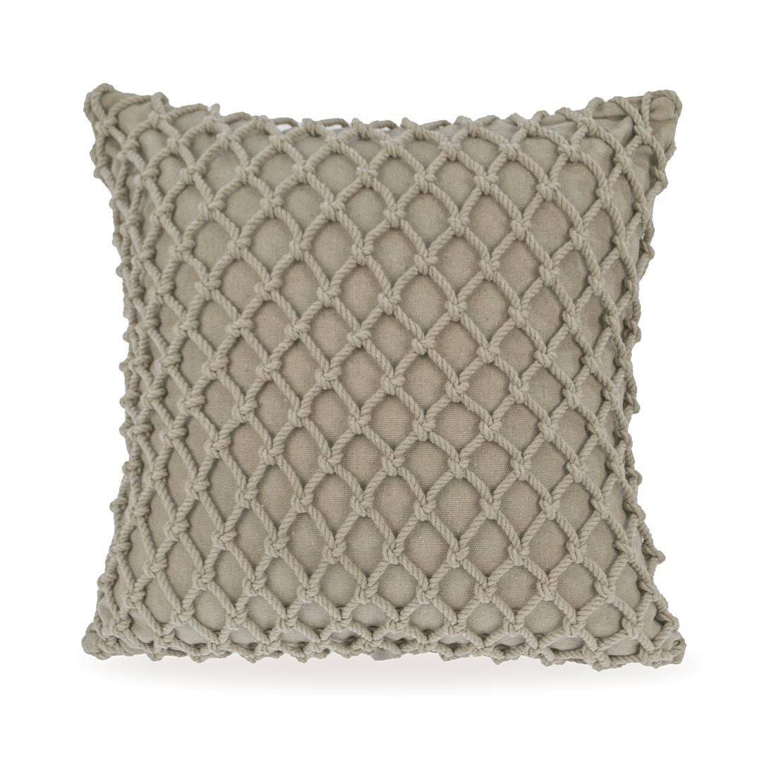 A Capa de Almofada Macramê é feita em tecido 100% algodão liso com acabamento feito à mão utilizando nós da tipologia artesanal macramê com cordas.