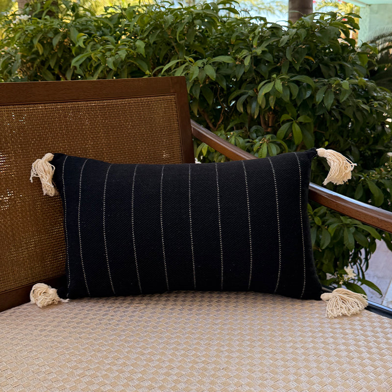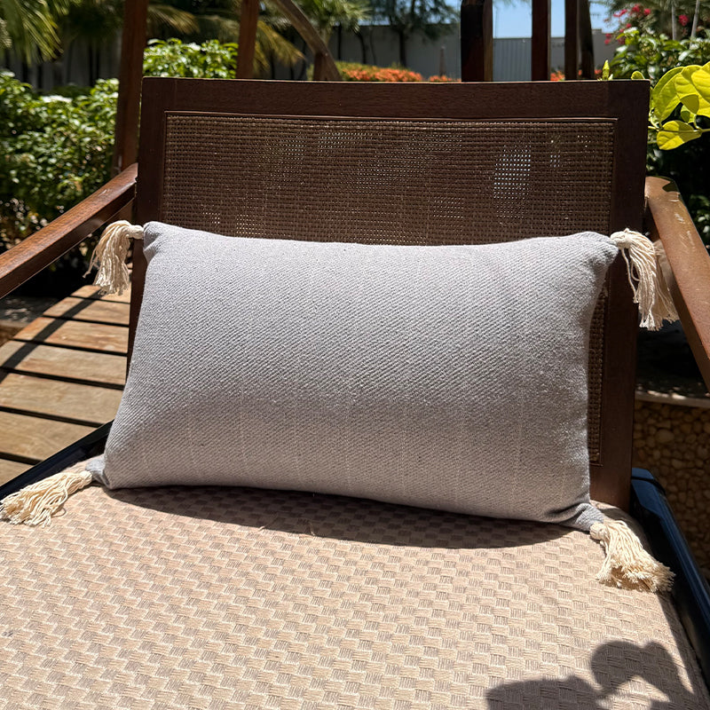 Transforme seu ambiente com o charme artesanal desta capa de almofada. Produzida em tecido de trama encorpada, ela combina elegância e conforto. O design listrado traz um toque contemporâneo, enquanto os tassels nas extremidades adicionam um ar descontraído e sofisticado.