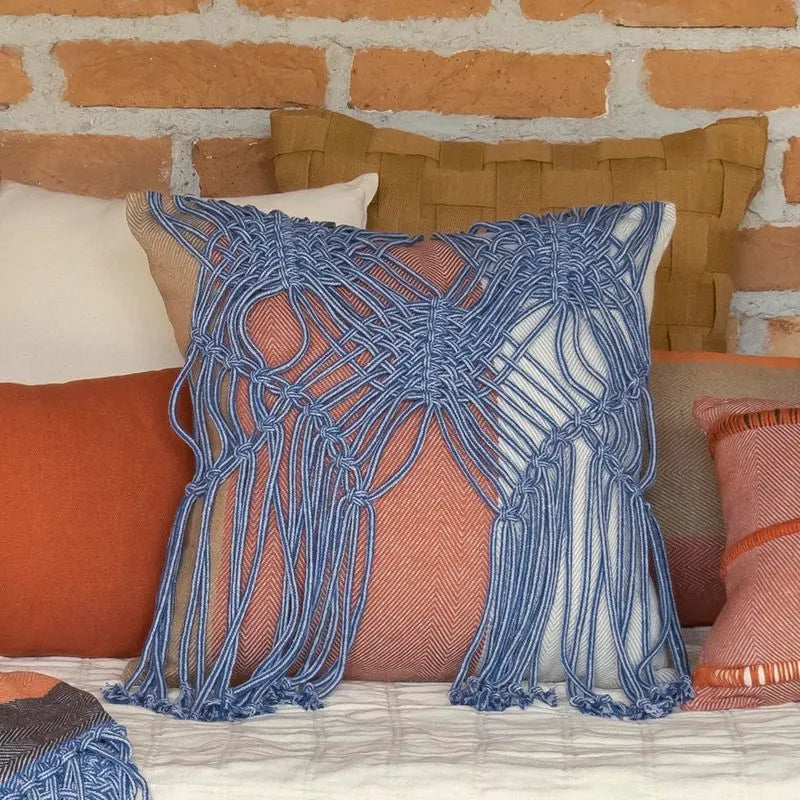 A Capa de Almofada Terra-Céu destaca-se pela combinação harmoniosa entre o macramê azul