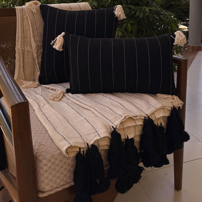 Composto por uma manta e capas de almofada em tons contrastantes de preto e cru, o conjunto une elegância e conforto em uma combinação atemporal. As franjas e tassels dão um toque artesanal e aconchegante, ideal para compor salas, varandas ou quartos com estilo moderno e acolhedor.