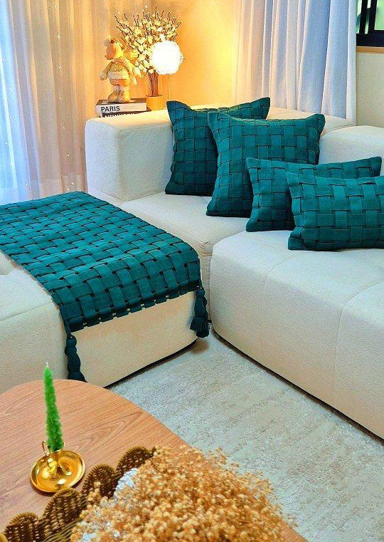 Feitas com trançado 100% artesanal, as almofadas utilizam tiras de mamucaba — tradicionalmente usadas para reforçar redes — reinventadas em uma técnica exclusiva que valoriza o feito à mão. O tecido é reciclado e não passa por tingimento, preservando os tons naturais e evitando impactos ao meio ambiente. Cada capa conta com fechamento em zíper, facilitando a higienização e a troca do enchimento (não incluso).