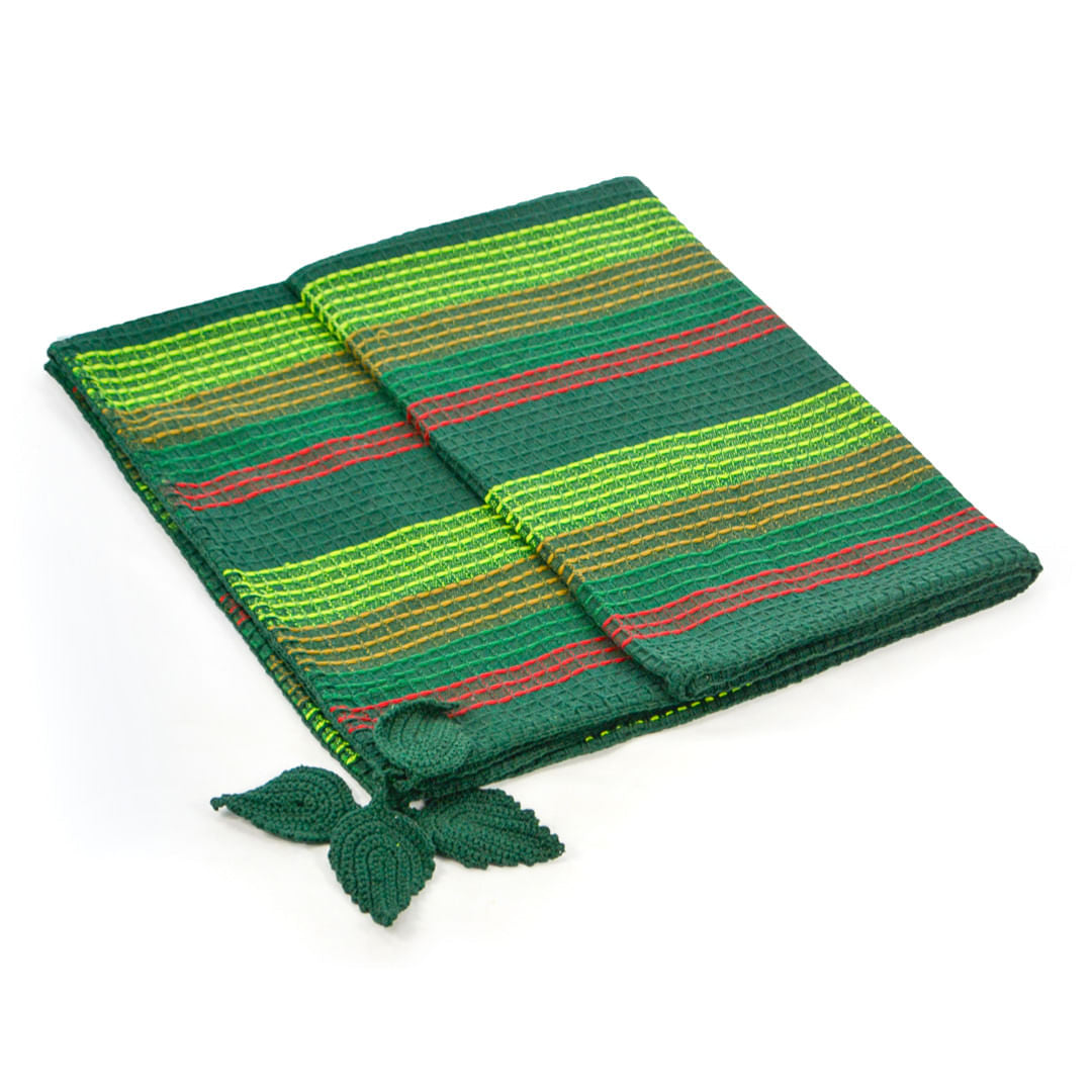 A composição de cores impõe o verde da floresta amazônica e as folhas colocam a mata tropical como ponto de atração dentro de casa. O grafismo faz referência à pintura corporal dos povos originários. O tecido em tear mecânico ganha aplicações em crochê em texturas surpreendentes.
