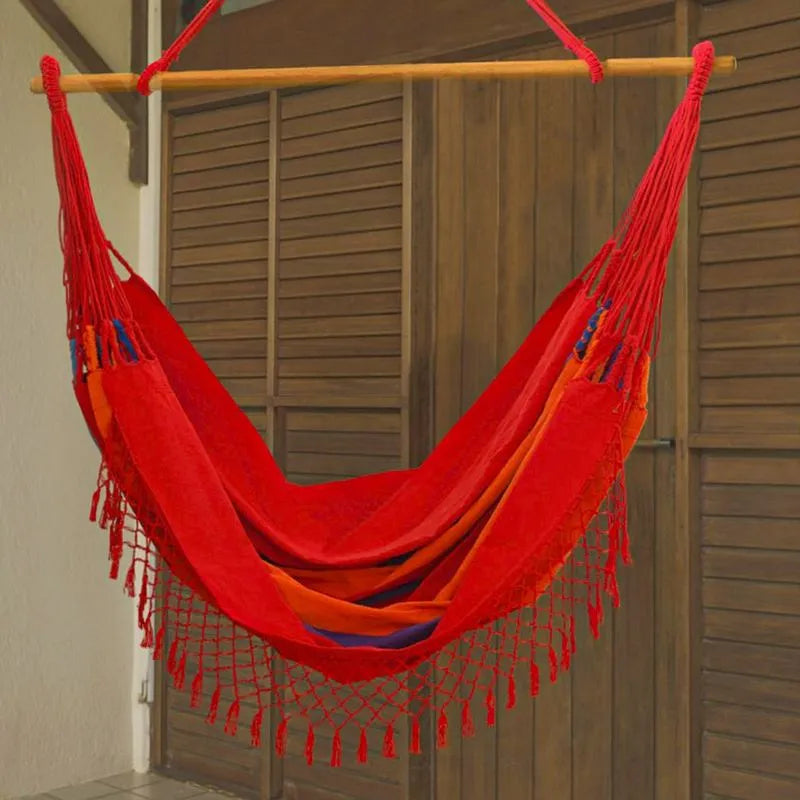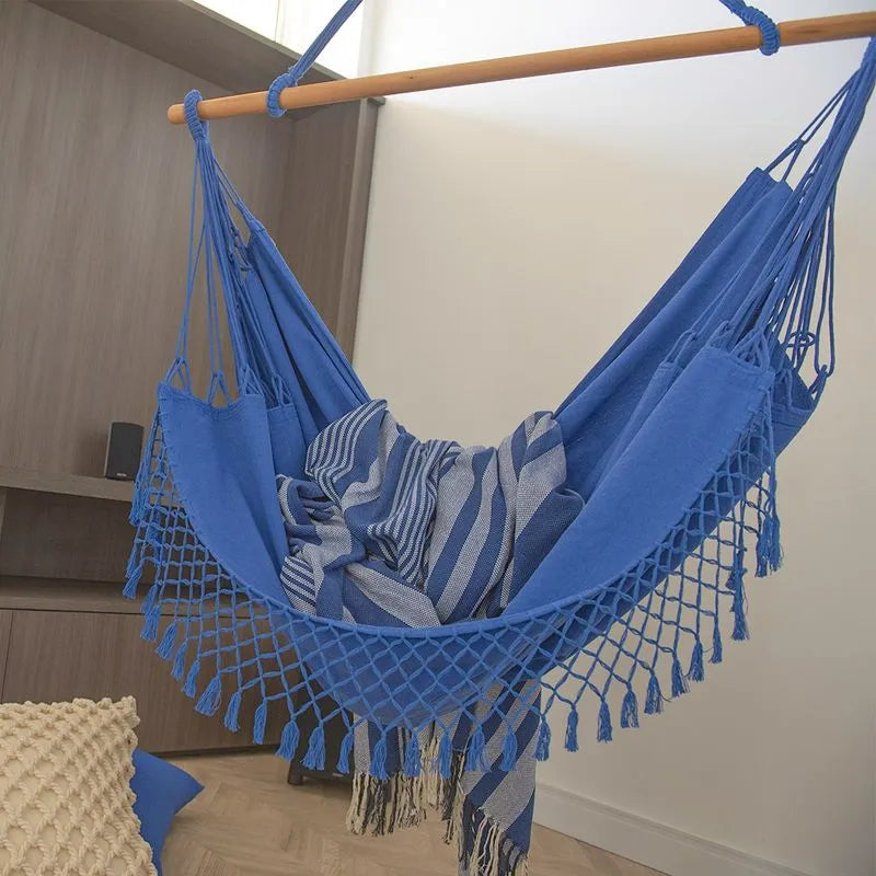 Uma Rede Cadeira Azul Royal pode dar aquele aspecto suave e firme à decoração da sua casa! Tem tecido reciclado, que aproveita as sobras de material da indústria junto com os fios de garrafa pet, e uma varanda na tipologia artesanal macramê. Os punhos, caréus e tranças também são feitos à mão.