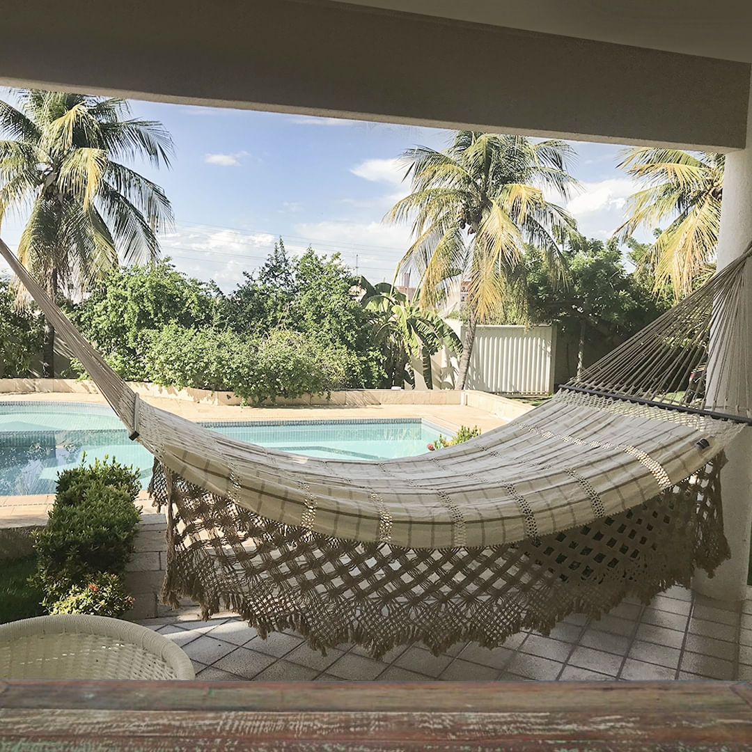 para acomodar toda a família. A varanda com macramê feito à mão dá o acabamento
