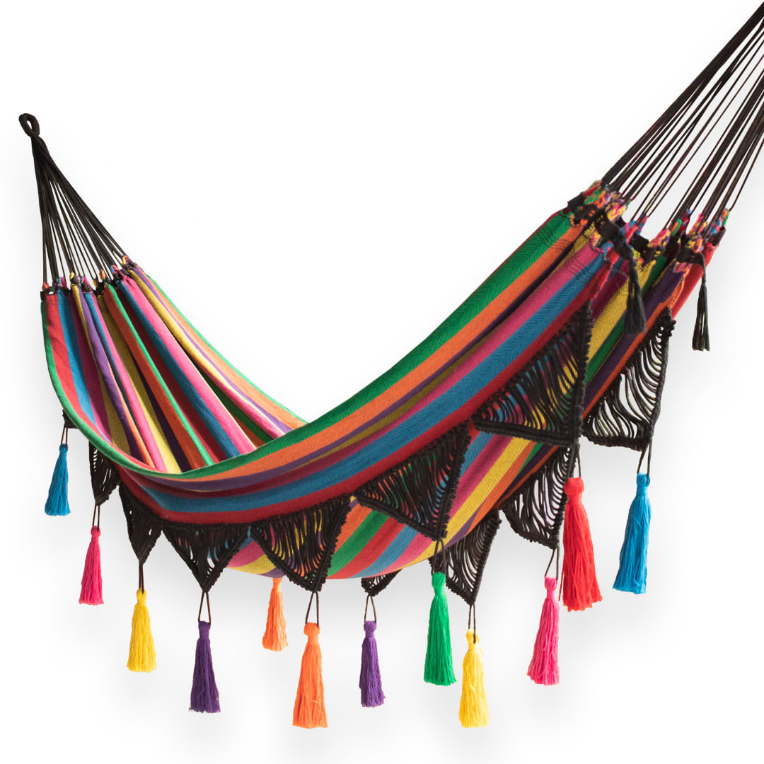 Procurando por uma rede colorida e inovadora? Nossa Rede Axé proporciona alegria e diversão ao ambiente. Seu tecido é reciclado, produzido a partir de retalhos das indústrias e fios de garrafa PET, e tem um pequeno relevo. Já a varanda é feita à mão na tipologia artesanal macramê com acabamentos com tessel colorido. Punhos, caréus e mamucabas são feitos à mão.