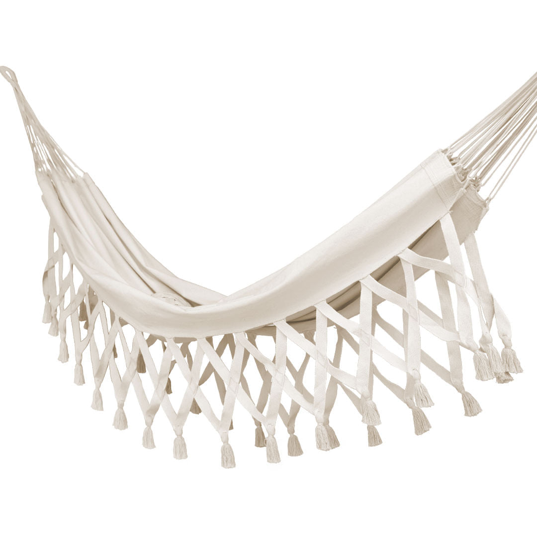 Simplicidade e leveza, a Rede Candura é perfeita para o seu ambiente. Toda em tecido 100% algodão, tem uma varanda em tiras com pontos de bordados manuais finalizadas com tessel. Punhos, careus e mamucabas feitos à mão.