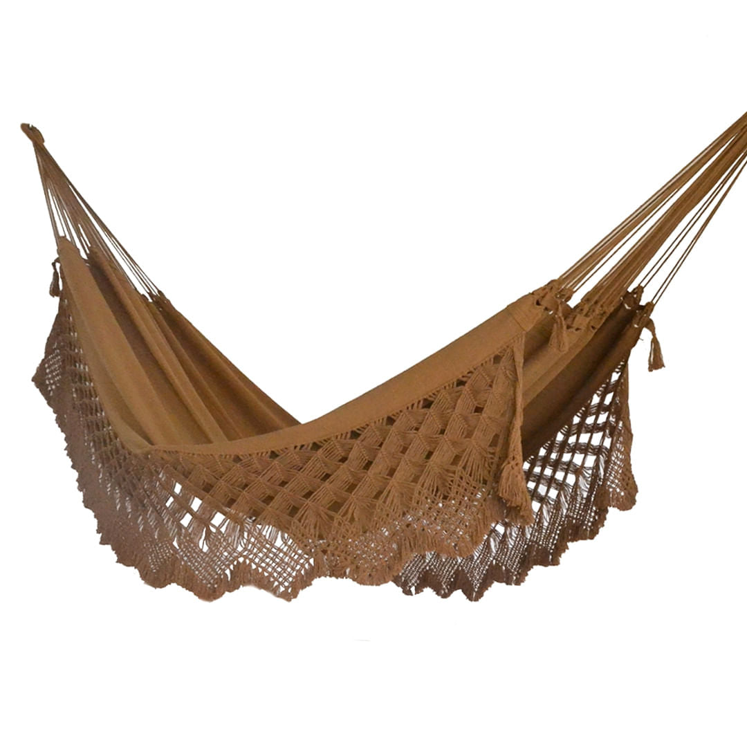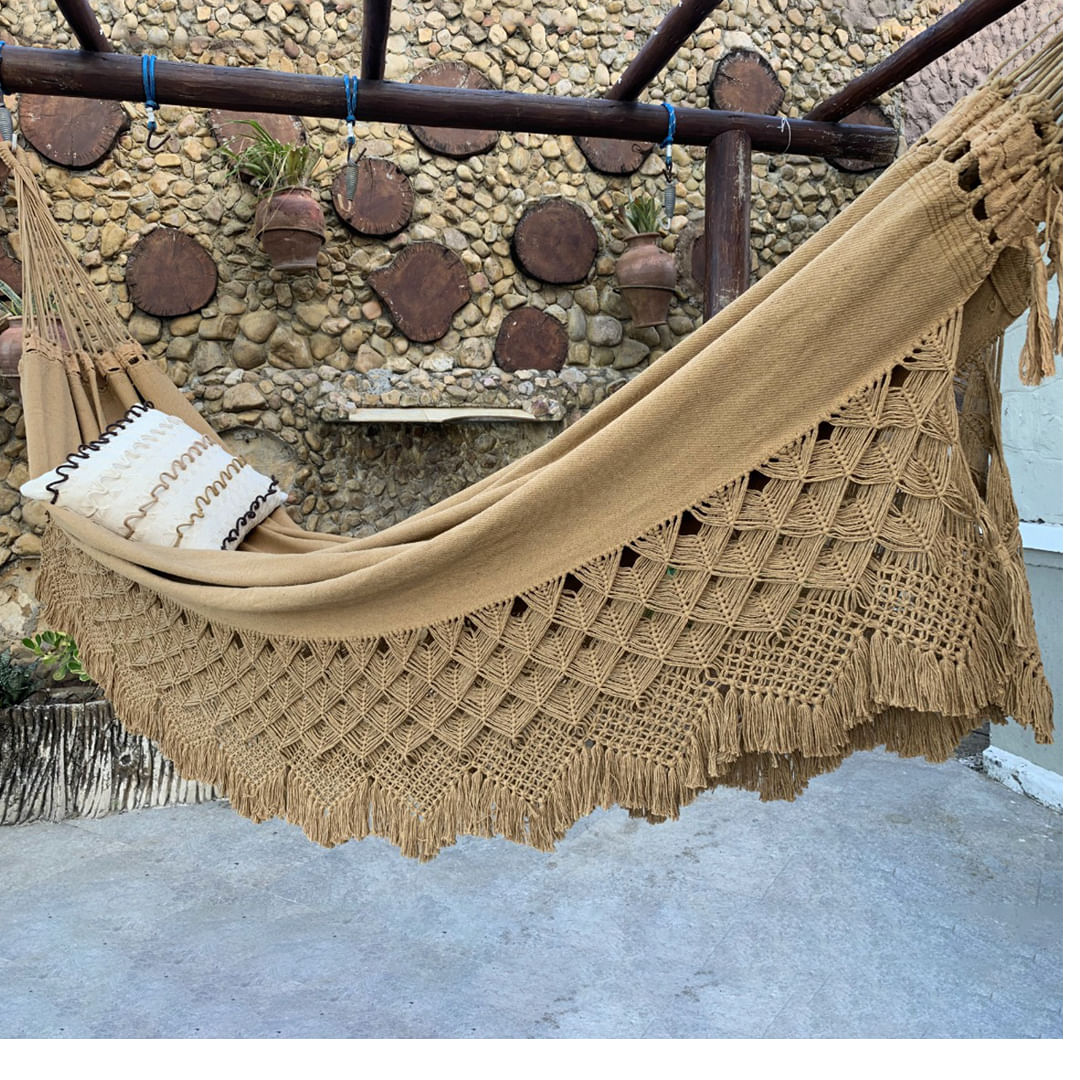 O caramelo está voltando com tudo na decoração e nossa Rede Elite Suque é o que você precisava para aproveitar o charme que essa cor proporciona. Seu tecido tem sutil textura e relevo e sua varanda tem um diferenciado macramê dando impressão de um desenho quase 3D. Os punhos, caréus e mamucabas também são feitos à mão e compõem cada detalhe da rede.
