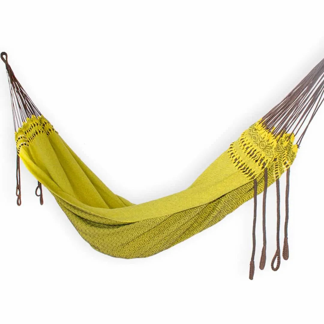 Um amarelo perfeito para encher o ambiente de alegria! A Rede Girassol é feita em tecido reciclado de alto relevo nas cores amarelo e marrom. Além da cor linda e vibrante, seu diferencial está atrelado aos punhos que descem das mamucabas. Ela não tem a tradicional varanda, é uma rede cheia de estilo e criatividade.