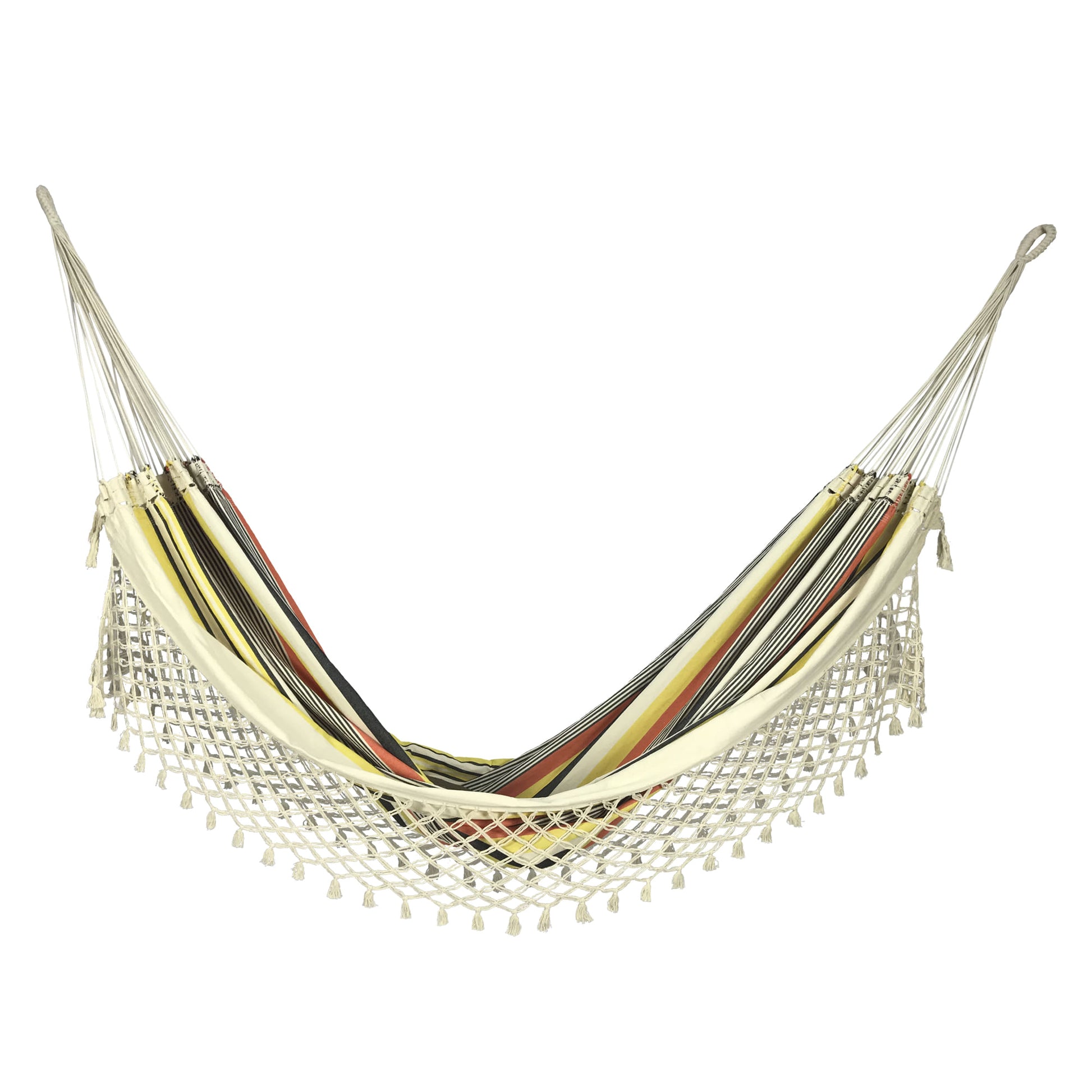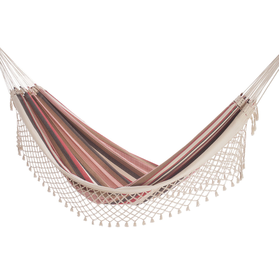 Uma homenagem à praia de Pipa-RN! Nossa Rede Pipa tem um tecido ecológico e com listras finas nas cores bege, caramelo, marrom e vermelho dando aquela alegria característica dos que visitam essa praia. A varanda é feita à mão usando tipologia artesanal macramê. Os acabamentos da rede, punhos, caréus e mamucabas também são feitos à mão.