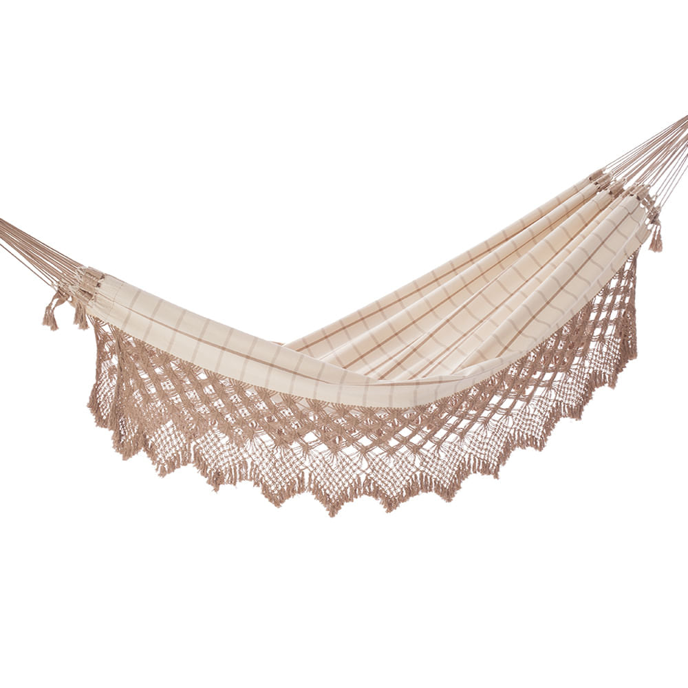 Um xadrez natural e minimalista. A rede Siri natural tem um tecido composto de algodão natural colorido e orgânico, onde a pluma já nasce colorida e dispensa o uso de aditivos ou corantes para tingimento e ainda economiza água. As linhas são intercaladas entre o algodão natural, cru e bege. Além de uma varanda na tipologia artesanal macramê linda. Os punhos, caréus e mamucabas também são feitos artesanalmente.