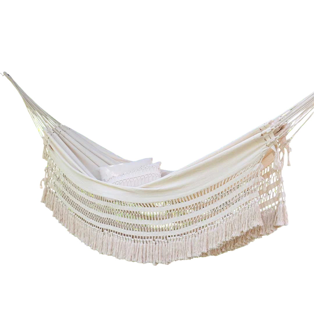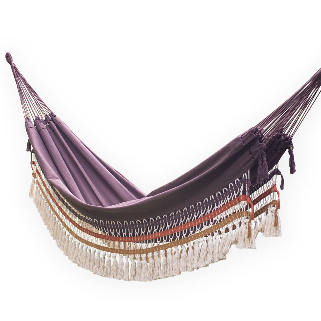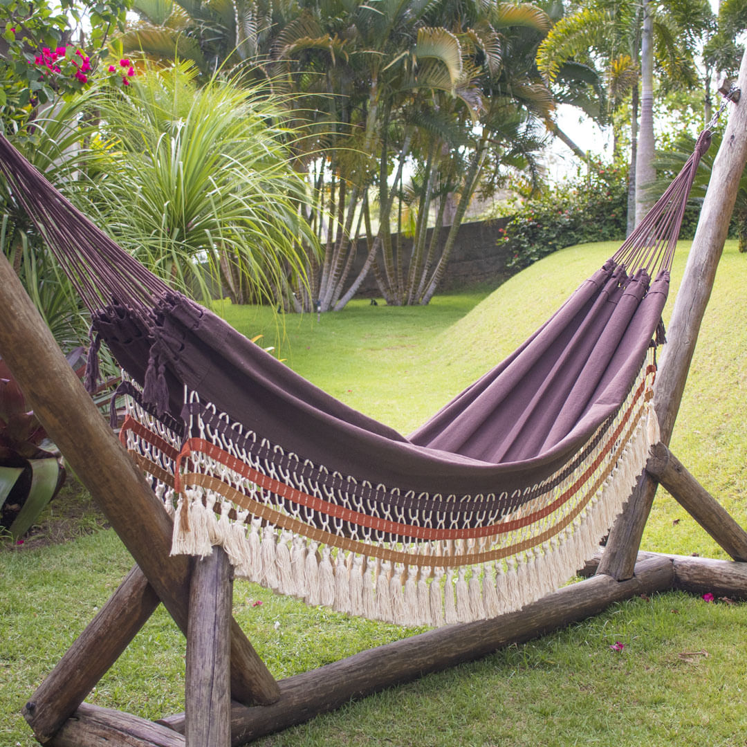 Fugindo do tradicional, a Rede Xingu Corrente em tecido plano de cor marrom, recria novas funções para os cabos e mamucabas que unem o corpo da rede ao punho. Uma nova trama na sua varanda! O tecido é reciclado de dor predominantemente marrom e a varanda tem uma diferencial tipologia artesanal macramê. Os punhos, caréus e mamucabas também são feitos à mão.