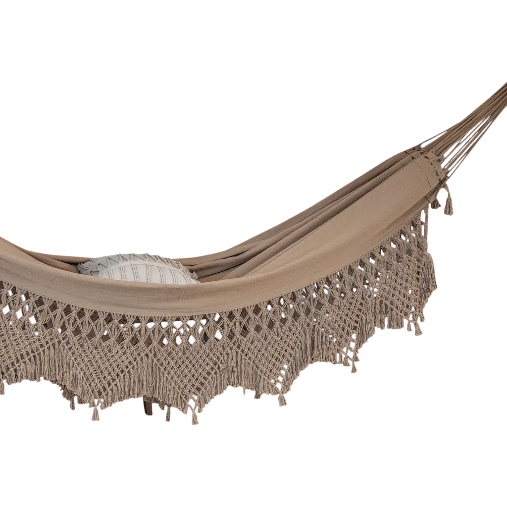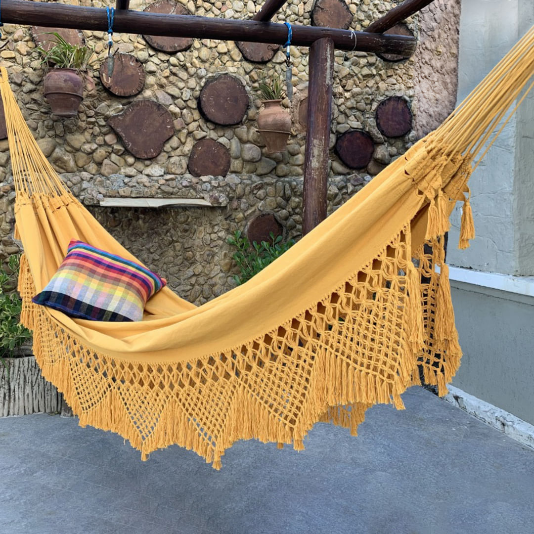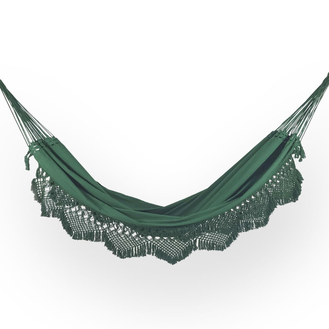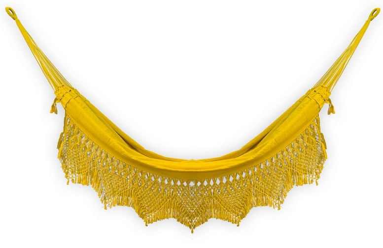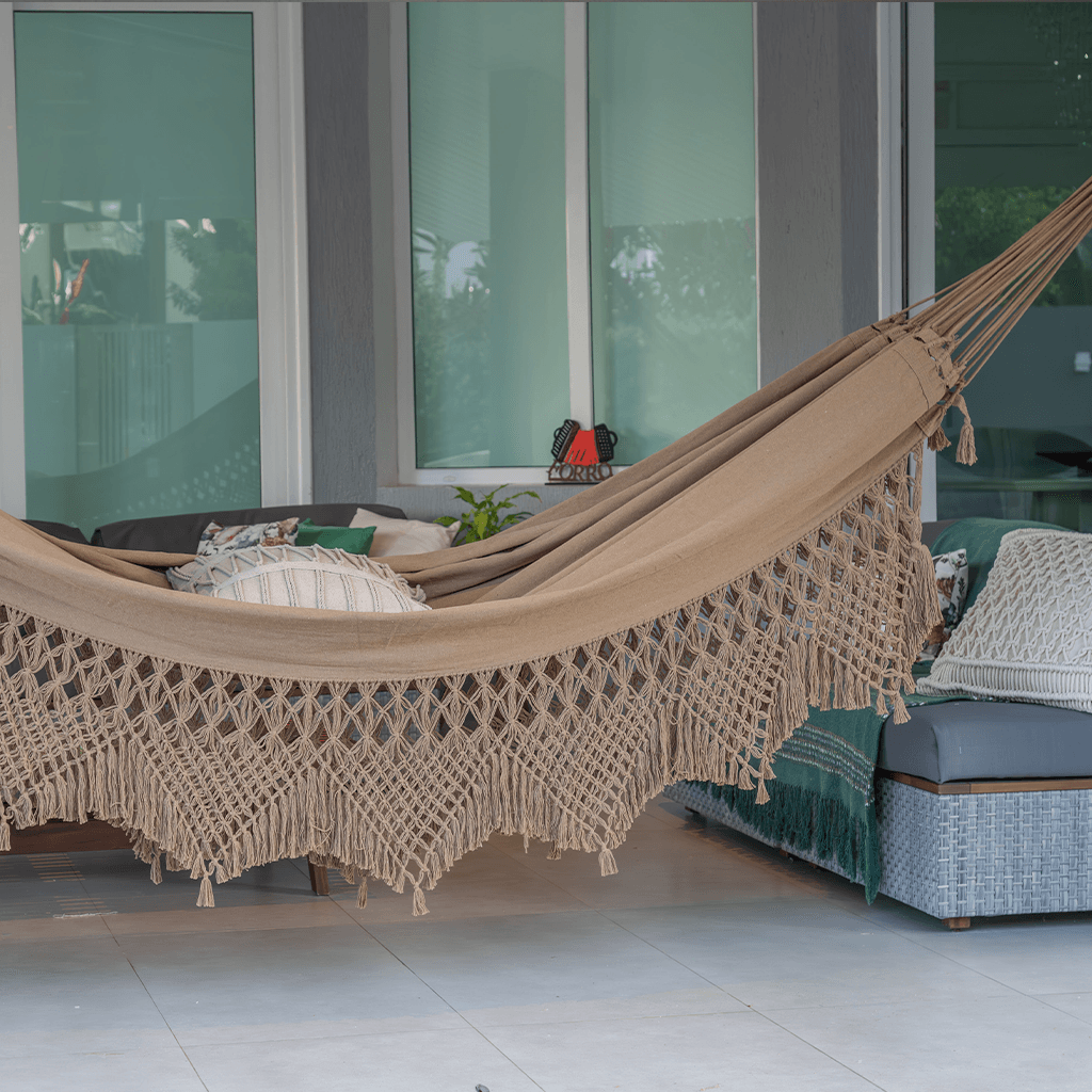 Disponível em diversas cores para melhor alinhar com a decoração da sua casa, a Rede Xingu é queridinha dos nossos clientes. Com um tecido ecológico na cor verde musgo e uma varanda 100% artesanal feita com um macramê característico das redes de balanço, tem todos os detalhes que a sua decoração merece. Os punhos, caréus e mamucabas também são feitos à mão.