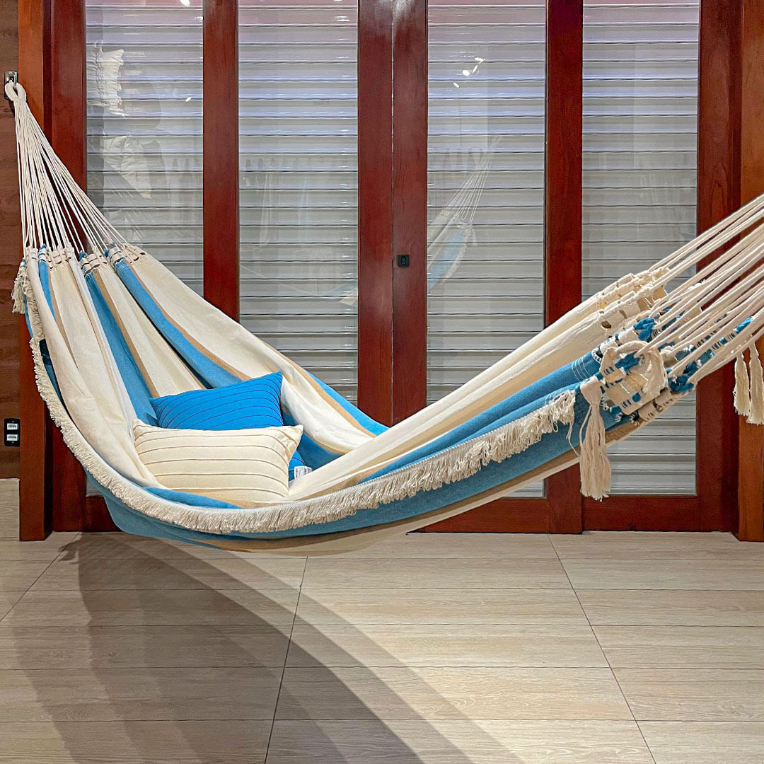 Franjas especiais na varanda! A Rede King Franja conta com uma varanda curta com franjas feitas à mão pelas nossas artesãs. O tecido é reciclado em tons de bege, caramelo e vermelho. Os punhos, caréus e mamucabas também são feitos artesanalmente.