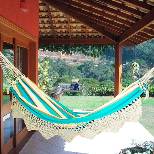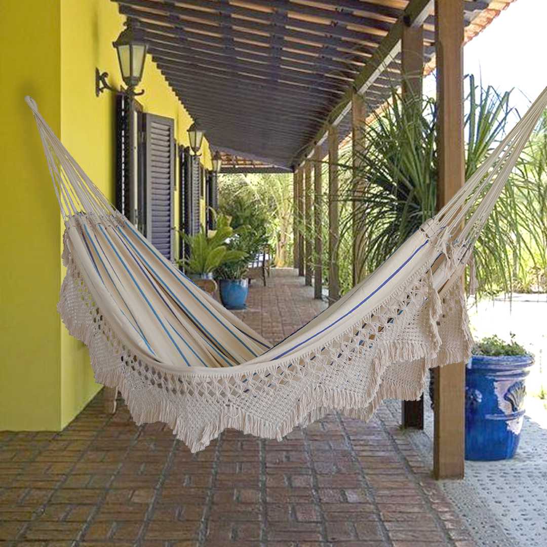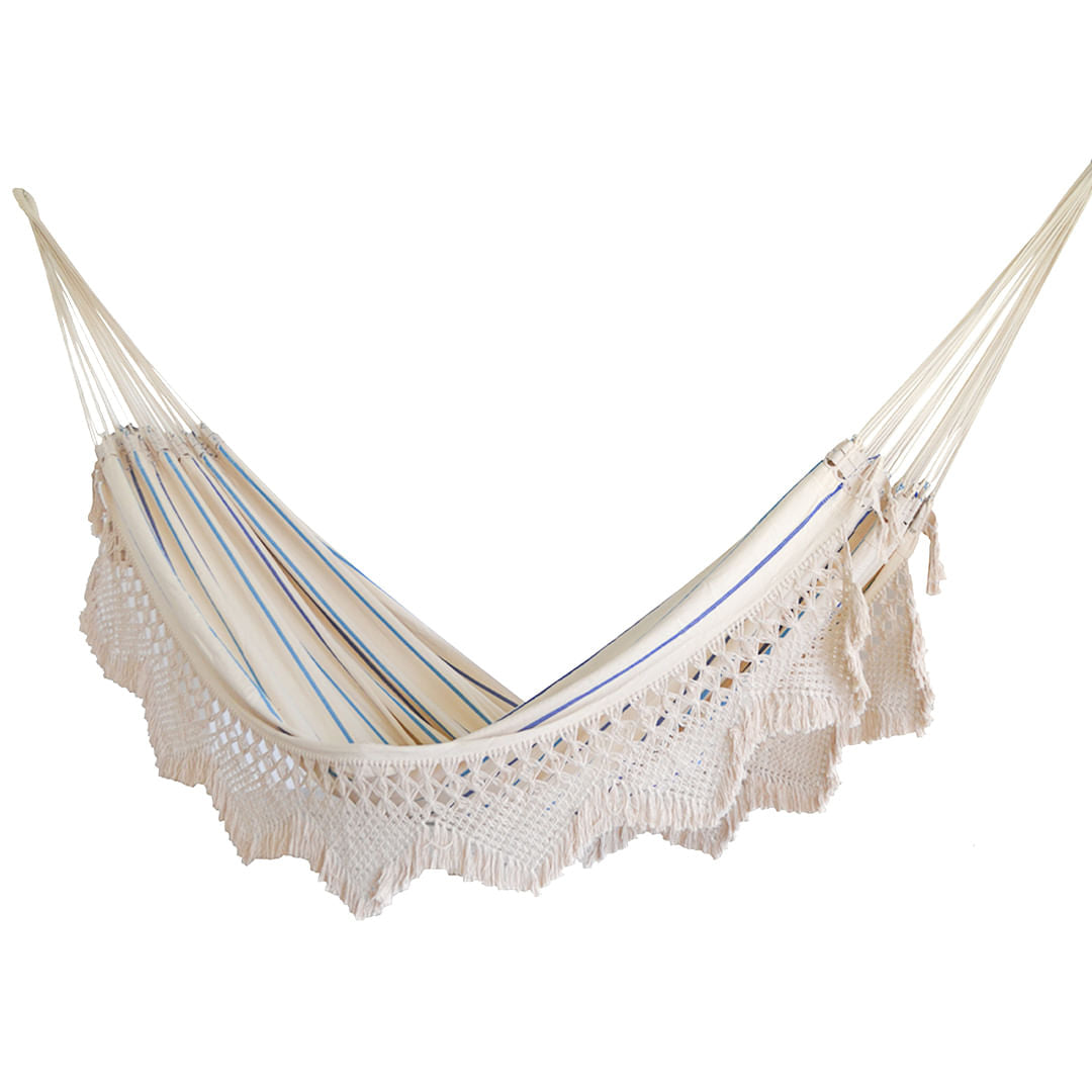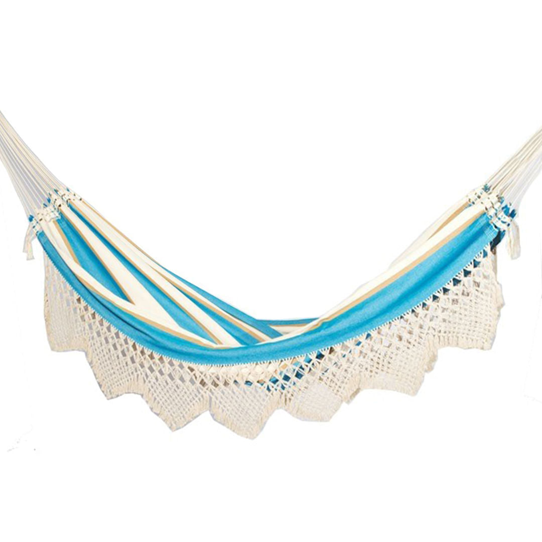 Listras azul turquesa e branco, são o carro chefe dessa Rede King. O tecido reciclado é produzido sem impacto ao meio ambiente, e a varanda é feita à mão, utilizando a tipologia artesanal macramê. Os punhos, caréus e mamucabas também são feitos à mão.
