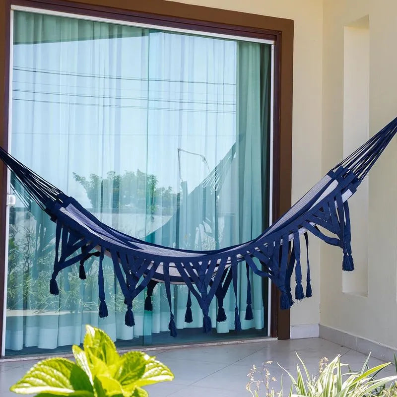 A Rede Leblon é sinônimo de elegância e sofisticação. Com design moderno, traz o azul profundo como protagonista, criando um contraste harmônico que valoriza qualquer ambiente. Seus detalhes artesanais em tiras largas e tassels dão movimento e estilo, tornando a peça única.