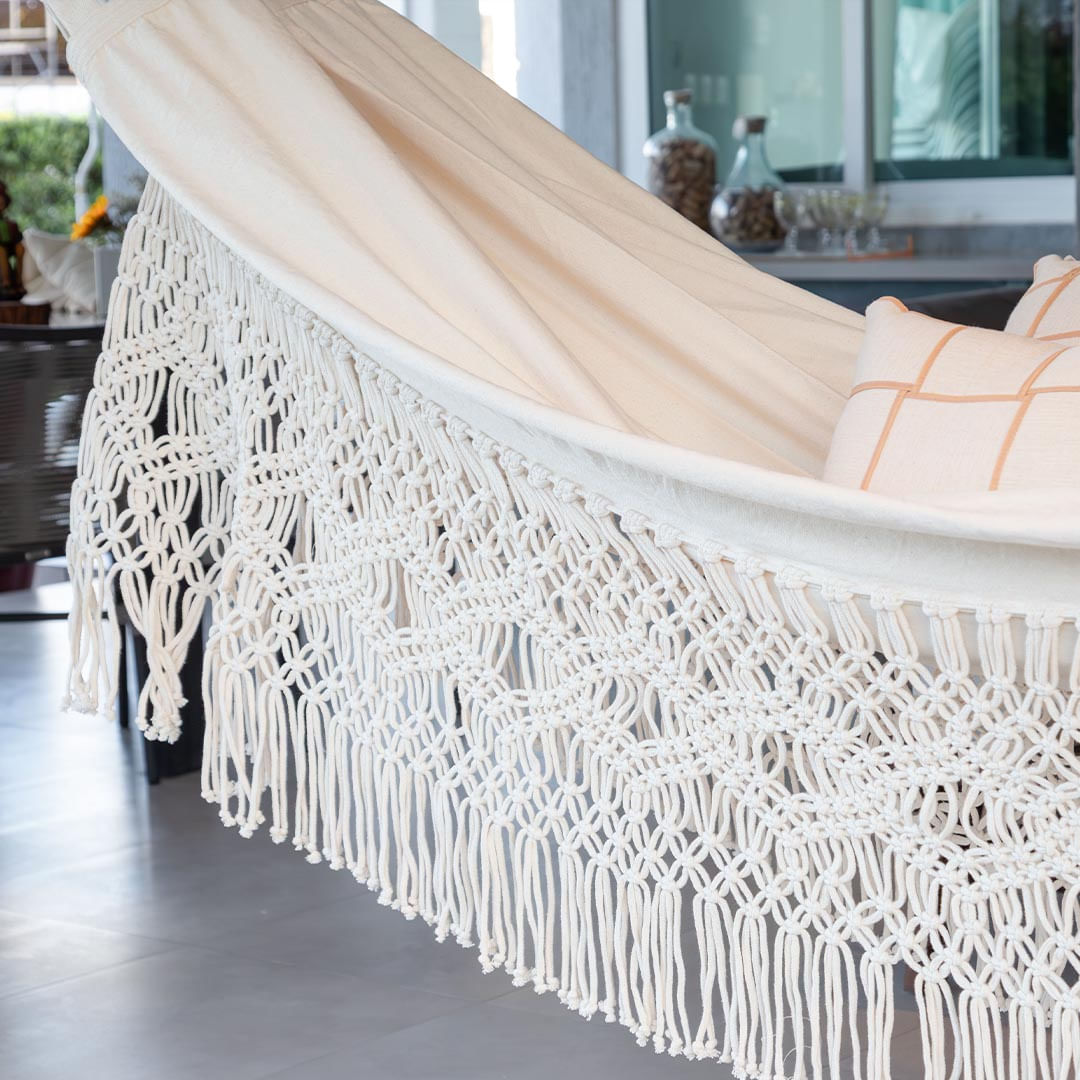 A Rede Losango é pura elegância artesanal. Confeccionada em algodão cru, traz a beleza natural das fibras e o charme do acabamento em macramê, trabalhado com delicadeza em desenhos de losangos que valorizam ainda mais a peça.