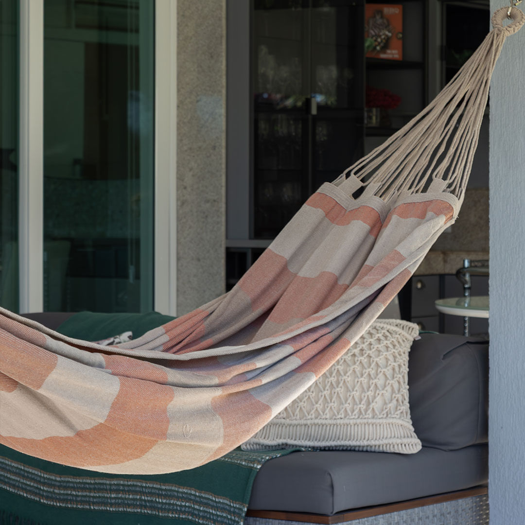 Conforto e estilo em um só produto! Essa rede traz uma combinação de cores neutras e terrosas que se adapta facilmente a diferentes estilos de decoração — do moderno ao rústico. Produzida em fio resistente e macio, oferece aconchego e durabilidade para seus momentos de relaxamento.