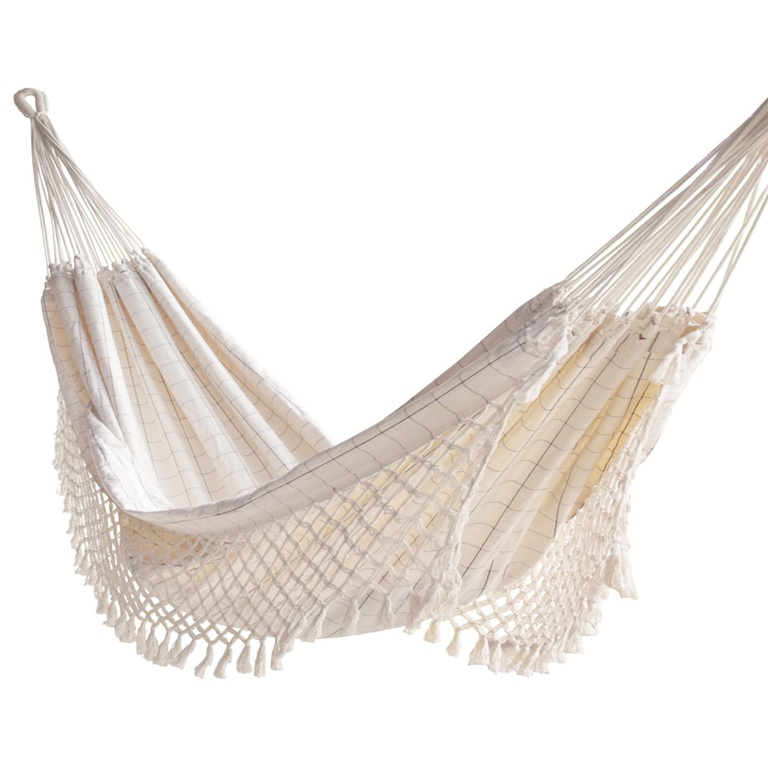Um espaço de descanso e tranquilidade em casa, é o que a Rede Capitonê pode te proporcionar. O tecido ecológico é leve e confortável, nas cores bege com listras marrom. A varanda usa a tipologia artesanal macramê, feita com nós. Os punhos, caréus e mamucabas são feitos à mão.