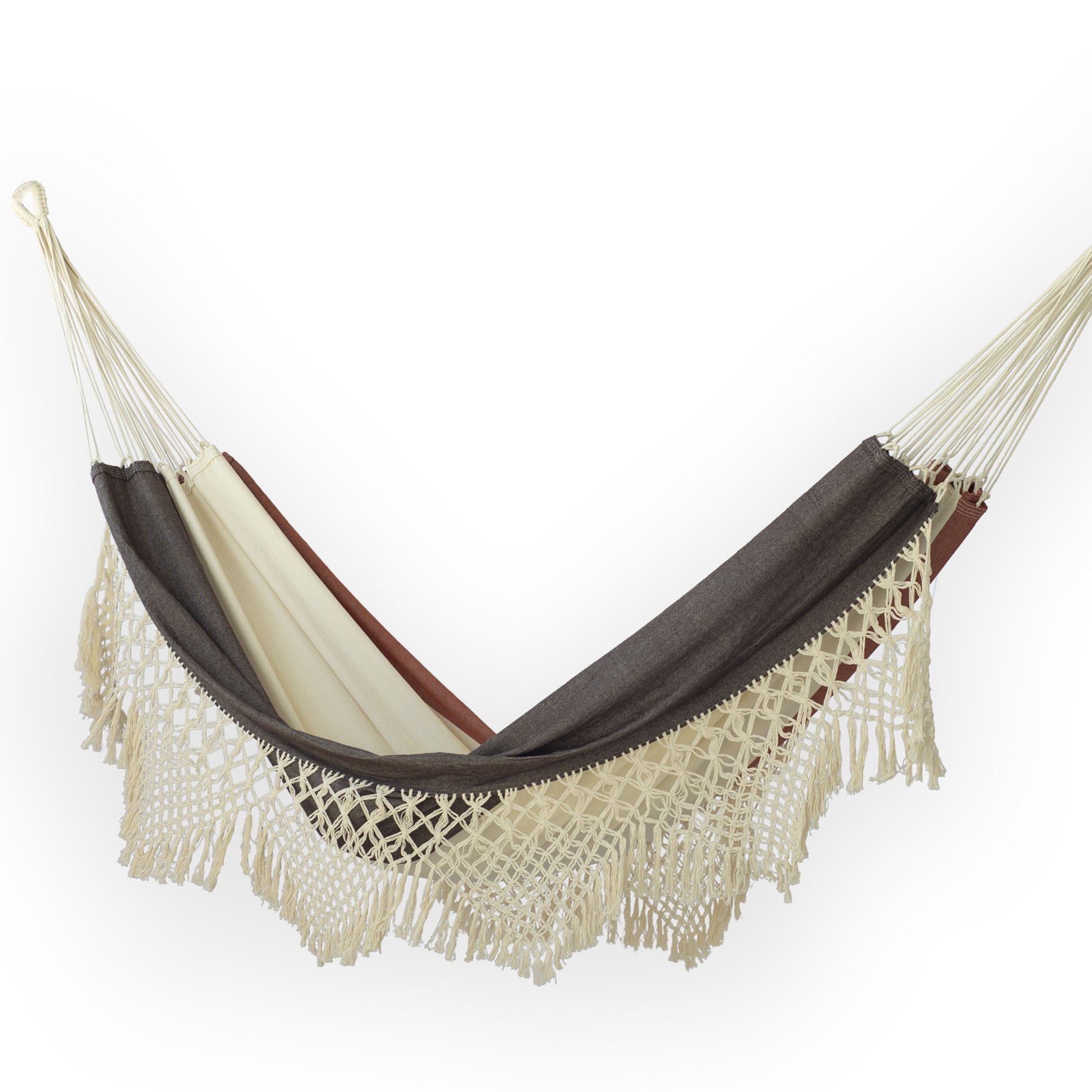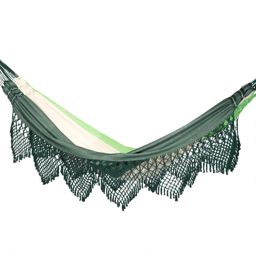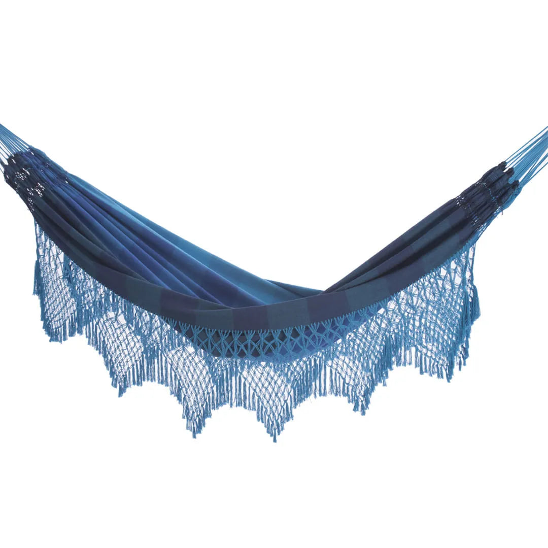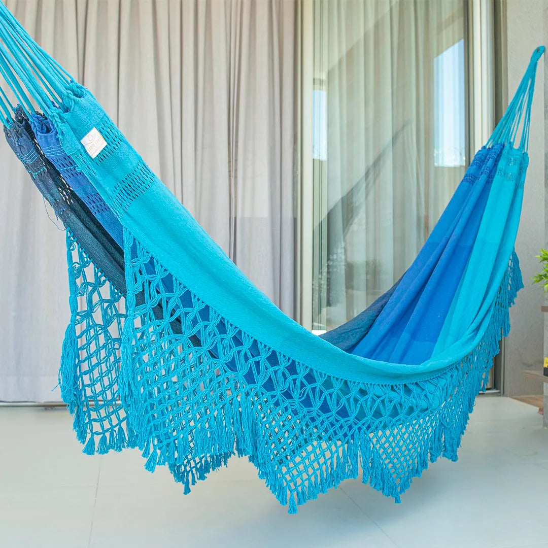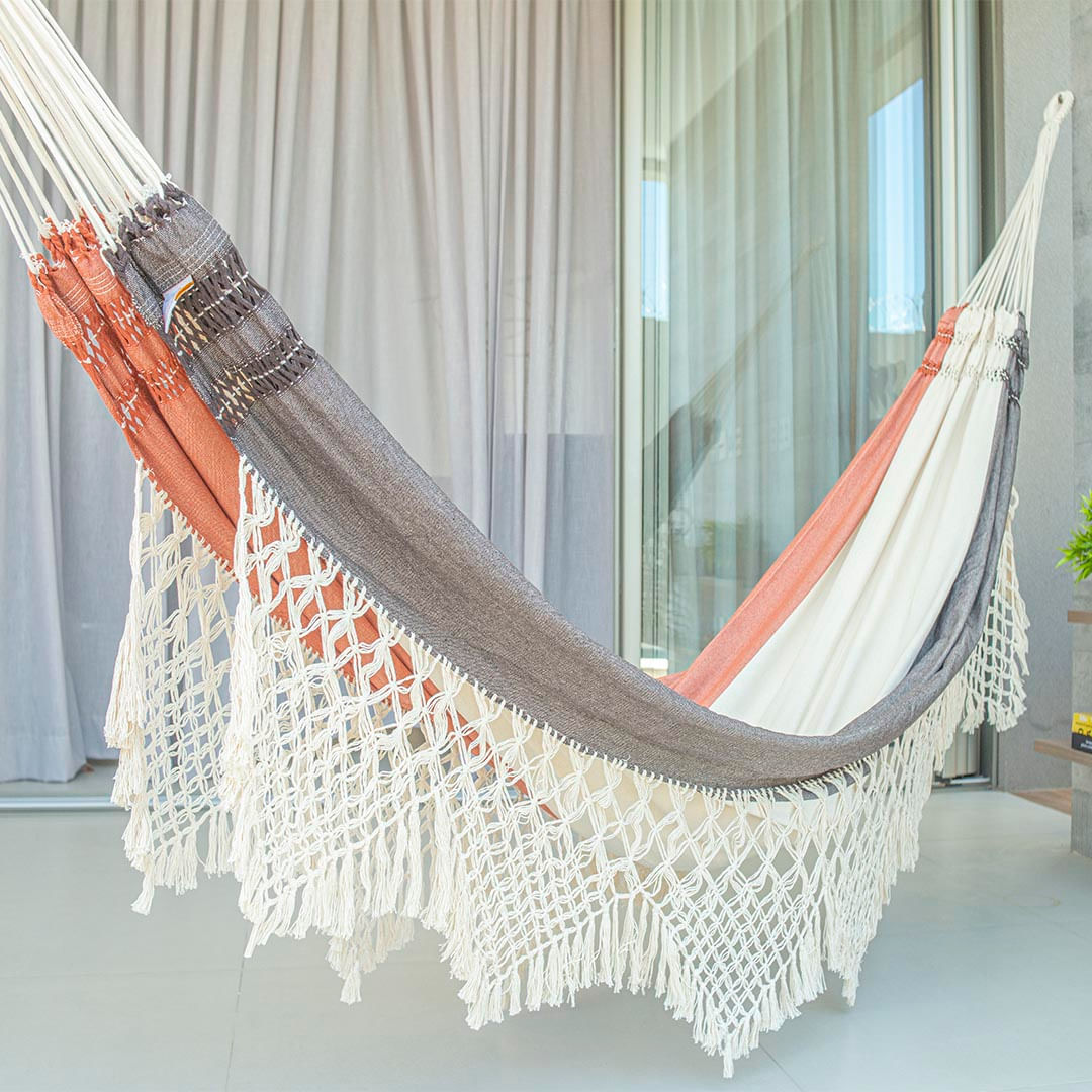 A rede Maragogi é uma homenagem à praia de Maragogi-AL. De tecido leve, disponível em diversas cores para melhor se adequar ao seu espaço. Feita com fio reciclado, plano e com uma varanda artesanal feita à mão em macramê. Os punhos, caréus e mamucabas também são artesanais.