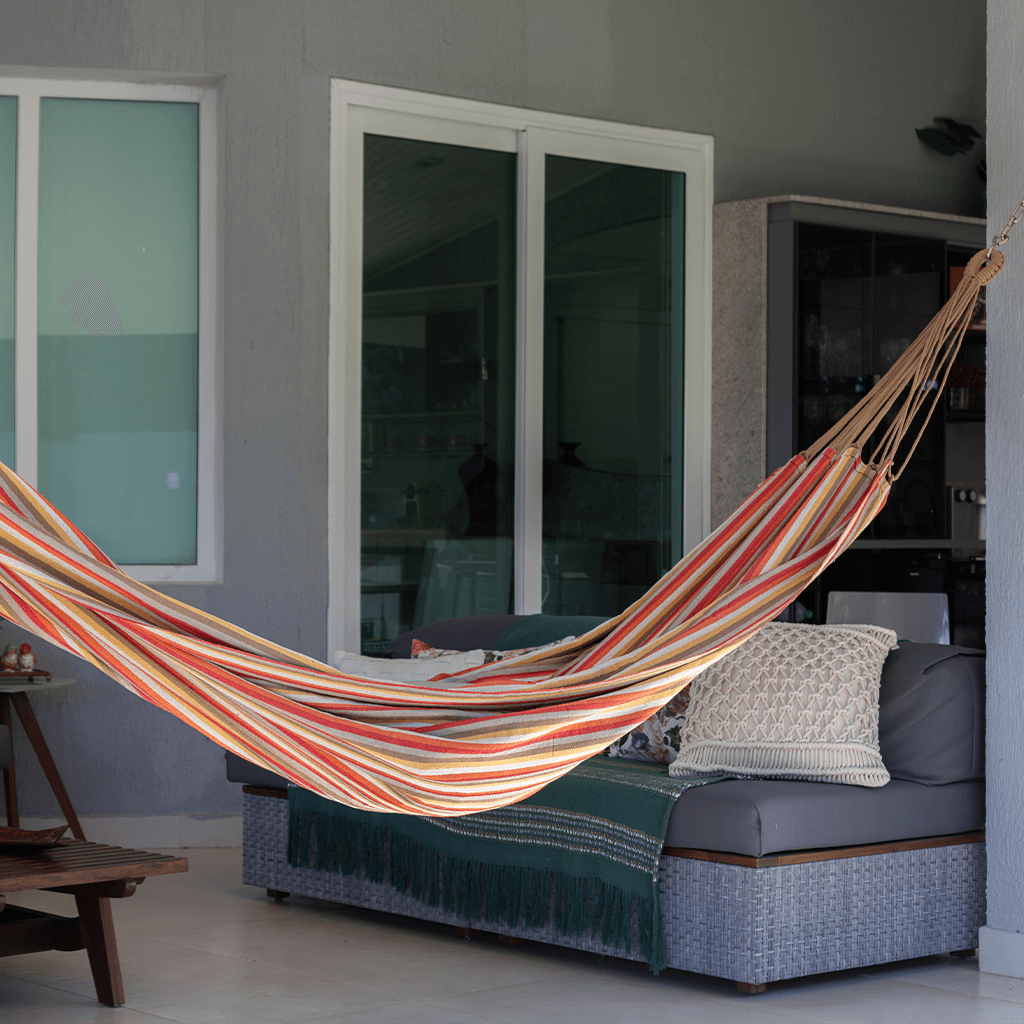 A rede de dormir Tambaú tem listras harmônicas, com cores vivas que se complementam. O tecido é feito a partir da reutilização dos retalhos da indústria com fios de garrafa PET. Uma rede usual e com muito estilo. Os punhos, caréus e mamucabas são feitos à mão