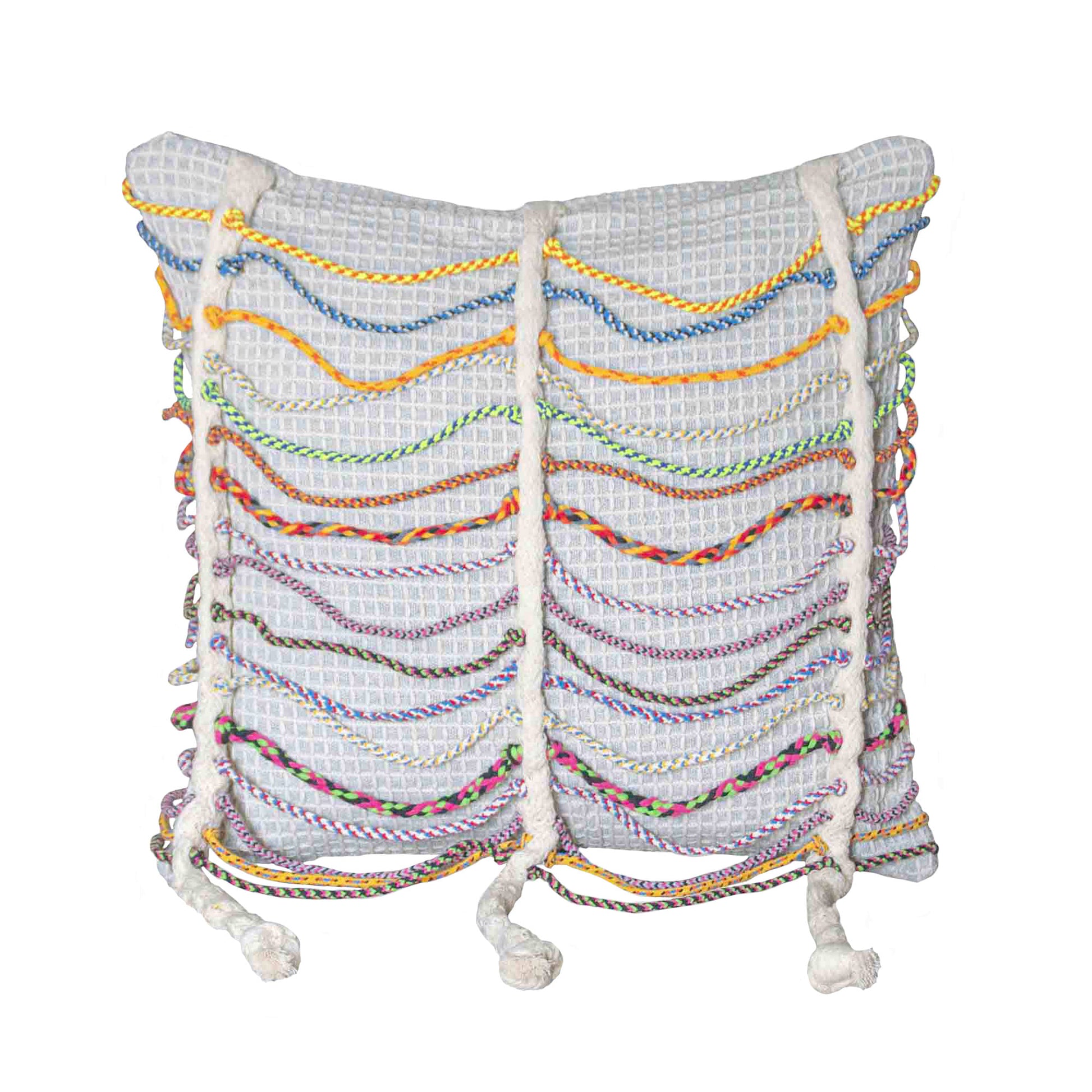 em cordas de trancelins coloridas. Não acompanha enchimento e tem fechamento em zíper.
