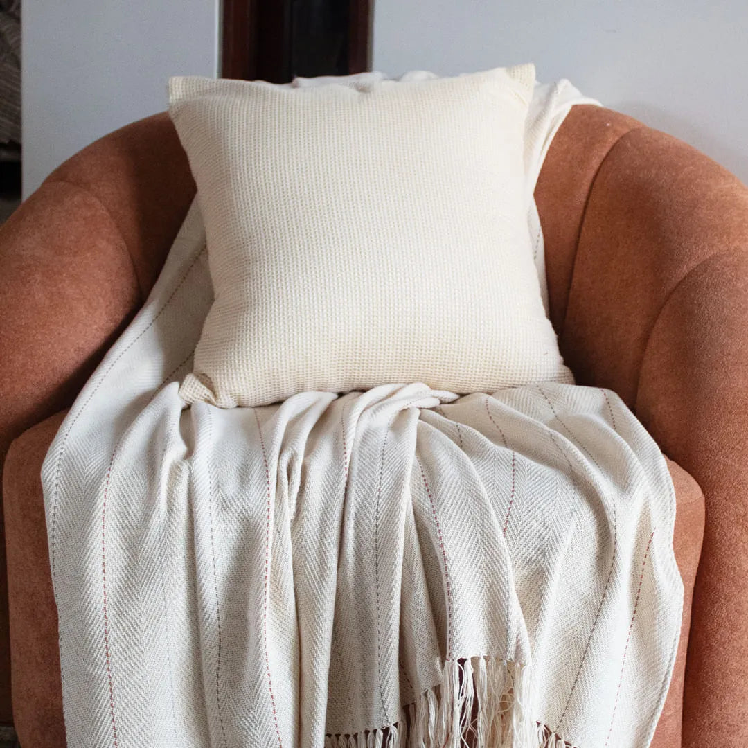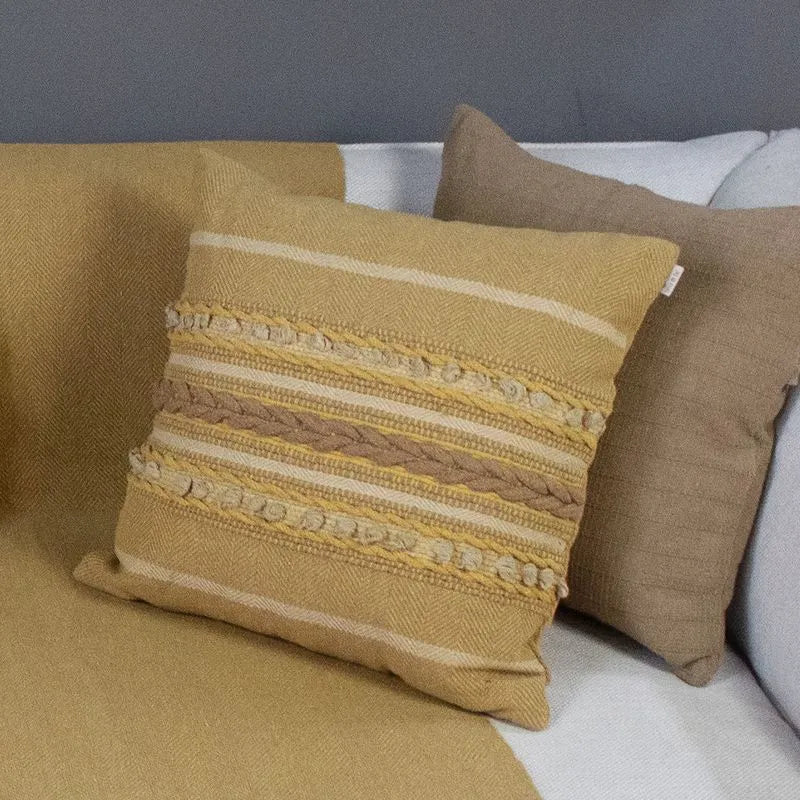 Almofada decorativa em tecido texturizado com detalhes trançados e fios em relevo, que trazem charme...
