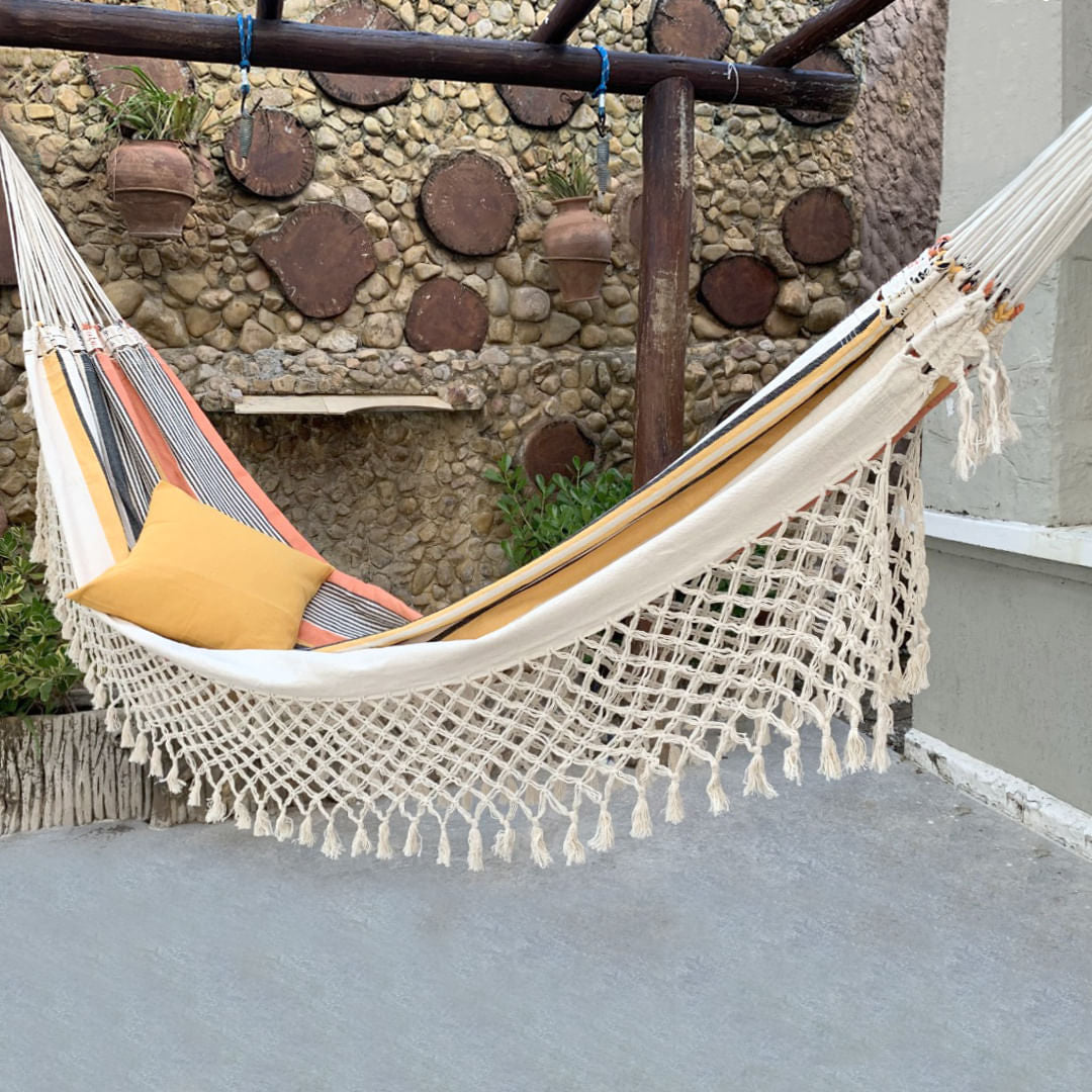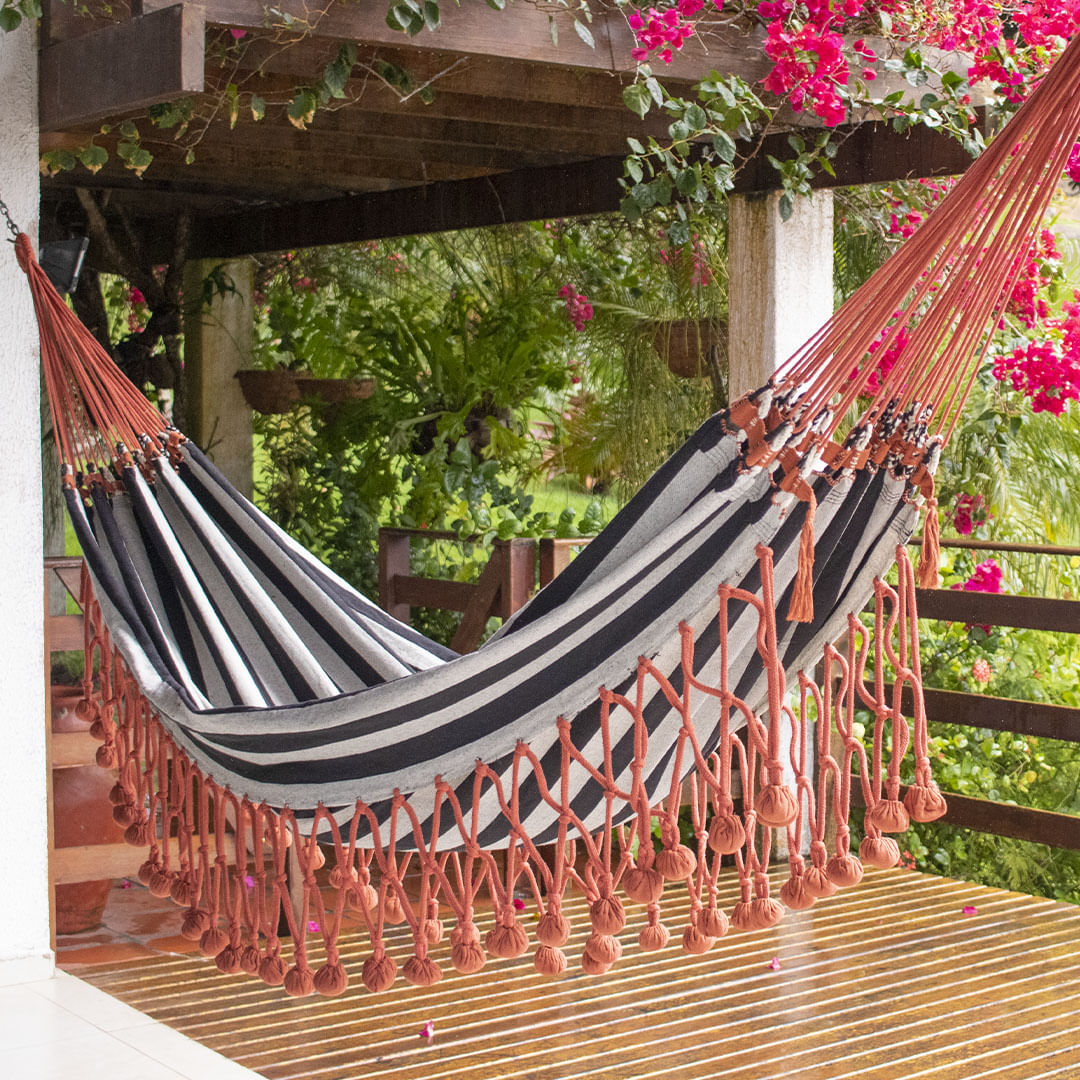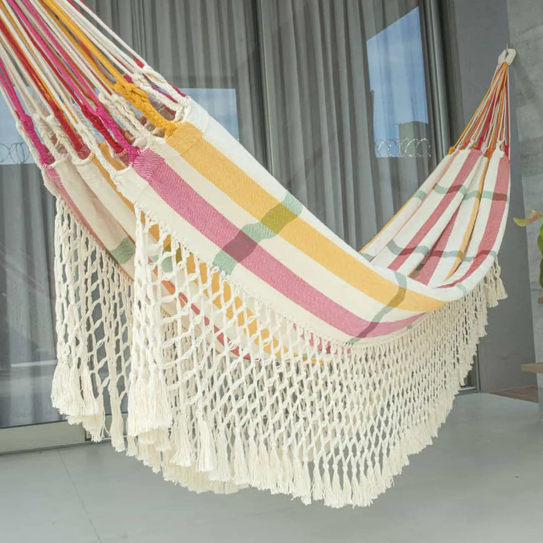 A tradicional rede na varanda, com aquele xadrez de neutras e alegres. A Rede Caponga...